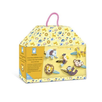 Add a touch of style to your hairstyle with this creative kit to create 6 glittery animal barrettes! Cute, fun and shiny: just what kids aged 5 and up love. This set lets little artists make and then wear their creations! All it takes is a little patience and meticulousness to easily make your own accessories, and proudly wear: an elephant, a lion, a leopard, a toucan, a sloth and a monkey. This set contains: 6 bars of 5 cm, 3 sheets of pre-cut, self-adhesive felt, 2 sheets of pre-cut, self-adhesive glitter, 4 pompoms, double-sided self-adhesive pastilles. No need for glue! A booklet is also included, with all the instructions and patterns to reproduce with the kit's contents. In all, it will take 10 minutes to make one barrette, or around 1 hour to create all 6. Thanks to their concentration and dexterity, jewellery and accessory fans will be delighted to create their own little treasures. Here's a fun creative hobby that's sure to satisfy DIY enthusiasts! What's more? The pretty printed box in the shape of a little bag that can be carried everywhere! This Exotic Animals barrettes kit is part of the Les Ateliers Bijoux collection.