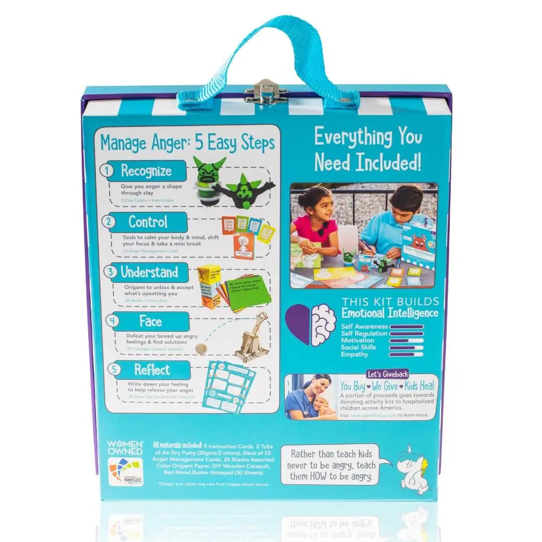 Kit Includes: 5 instruction cards, 2 tubs of air dry putty, Deck of 52 anger management cards, 50 sheets assorted color origami paper, DIY wooden catapult, 50 sheet bad mood buster notepad