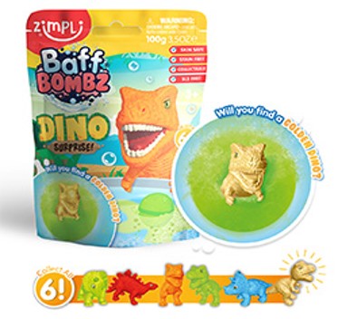 Create a colourful fizzing bathtime adventure by dropping these bubbling bath bombs into your bath water watch them fizz what suprise willyou find. With 6 Dino figures to collect, can you find the ulta - rare Golden Dino.