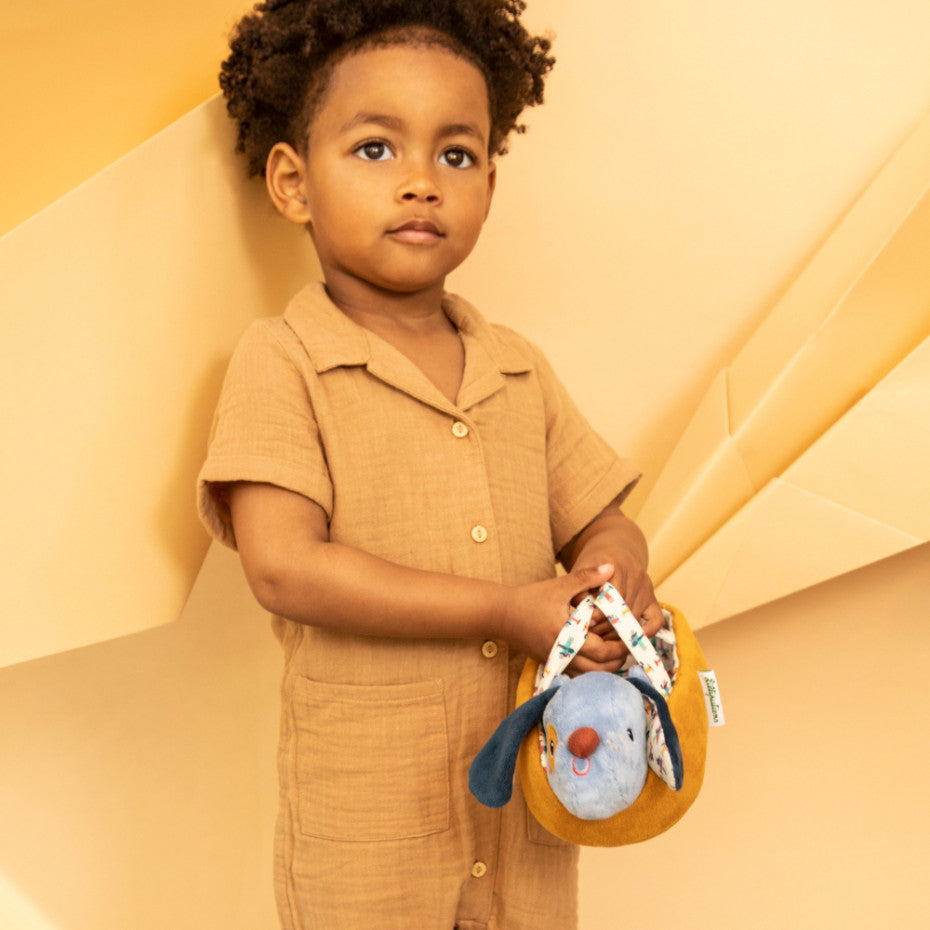 This cozy basket welcomes the charming puppy Jules. With his soft fur, he awaits to be pampered. By his side, a bowl and a chew bone, ready to be nibbled on. The child puts on his little jacket and gently strokes him. Jules barks happily when taken care of.