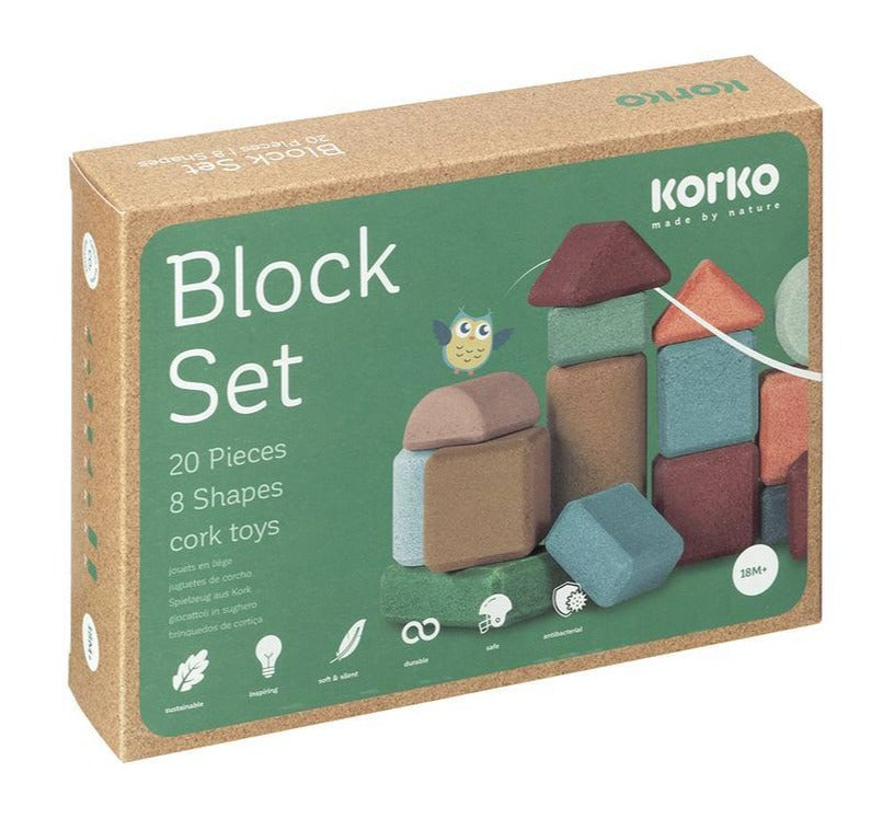 Building blocks are an educational toy. Cork building blocks teach little ones about cause and effect, promote their fine motor skills and let their imaginations run free. Thanks to their unique nature, they are particularly great for stacking, lining up, building with and even for knocking down towers of blocks without a loud crash or risk of injury. Perfectly suited for promoting dexterity through play thanks to their very special texture, our building blocks are suitable for tiny tots from just 18 months old.