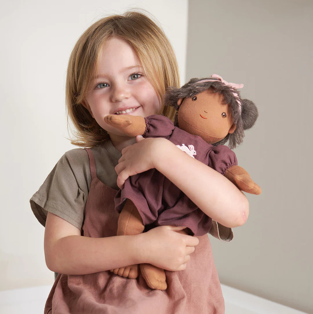 A weighted baby rag doll made from soft jersey, wearing a linen style baby grow. Remove the outfit to find a soft white removable nappy! Complete with a lovely embroidered face and realistic woollen hair, this soft and cuddly fabric baby doll is perfect for pretend play.