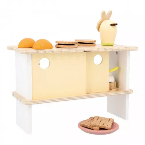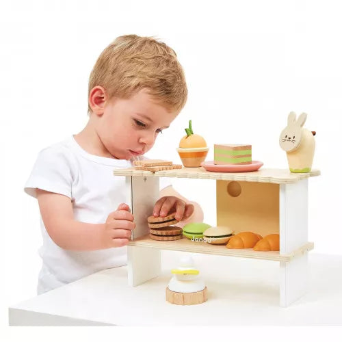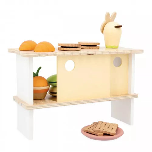 Would you like some cake? This wooden pastry stand displays pastries, cookies and other baked goods at any time of the day! Children aged 3 years and up can play market keeper and imitate adults at the market or bakery. 12 gourmet desserts are offered in total: 2 chocolate-filled biscuits, 2 butter biscuits, 2 cute macaroons, 2 delicious croissants, 1 apricot cake, 1 yummy lemon meringue pie, 1 good pistachio cake and 1 pretty rabbit-shaped cake. Our budding pastry chefs can present their wooden cakes and biscuits in the display case or on the serving plate... they’re bound to get your mouth watering! Little ones can serve their cuddly toys or the whole family, and open the sliding door at the back of the display cabinet to grab the chosen delicacy. This mini stand can easily be placed on a table and encourages little ones to share: there’s bound to be something for everyone! This sweet pretend play toy also stimulates little ones’ imaginations: what if the pistachio cake had courgettes in it? Thanks to all the supplied accessories, the delights on offer from this pastry stand can be consumed without moderation!