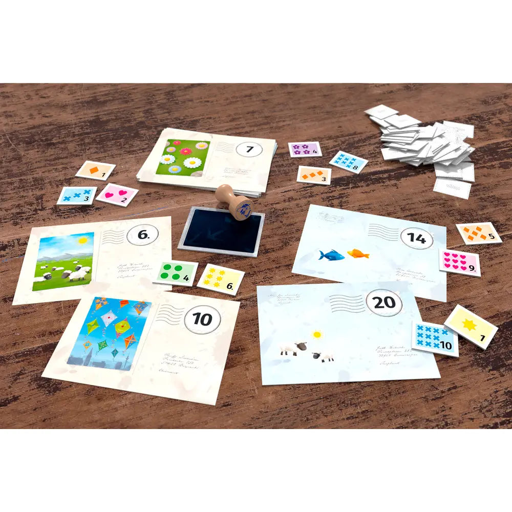- Fun addition game with numbers from 1-20. - Two levels of difficulty: learn to calculate and consolidate. There’s a lot of excitement at the post office! Pio of the Pigeon Post has his hands (or rather, wings) full. There is so much mail waiting to be sent out– but please make sure you use the right stamps! The children help Pio calculate the right postage. They’ll need a little luck and, above all, some good math skills to get the job done. The player who can correctly calculate postage for the most mail wins. Content: 1 wooden stamp, 20 large cards, 53 stamp tiles, 1 stamp pad tile, 1 rulebook.
