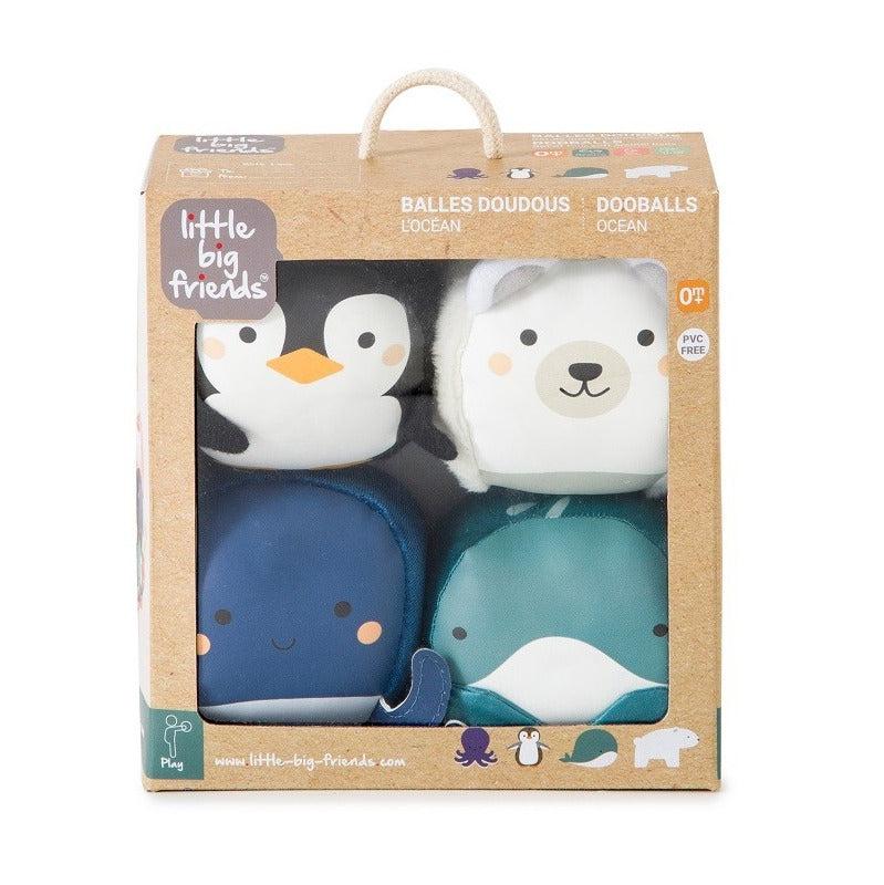 This set of 4 adorable soft balls includes a penguin, whale, octopus and polar bear. Fun and adorably shaped sensory toys that help promote early childhood development. Entertain for hours! The round shape and soft texture allow little hands to easily grasp and play. It helps promote motor skills and hand-eye coordination. The unique material is soft, hypoallergenic, and easily cleaned. Multi-textured fabrics provide sensory-stimulating and tactile play.