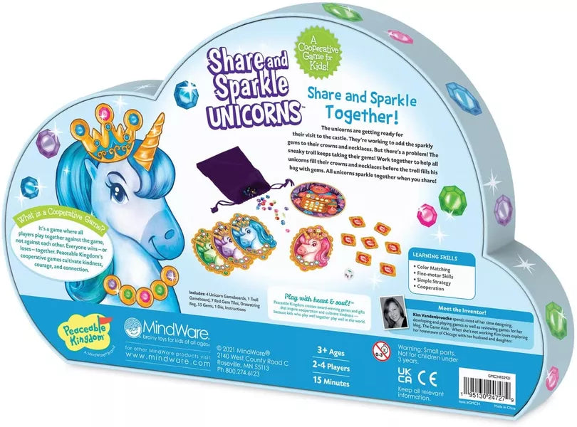 Share and Sparkle Unicorns is a delightful and engaging game that combines whimsical magic with valuable learning opportunities. It's a perfect choice for introducing young children to cooperative play, color matching, and basic strategy, all within a fantastical, sparkly setting. So, gather your little helpers, roll the die, and embark on a quest of gem-gathering and Troll-thwarting adventure!