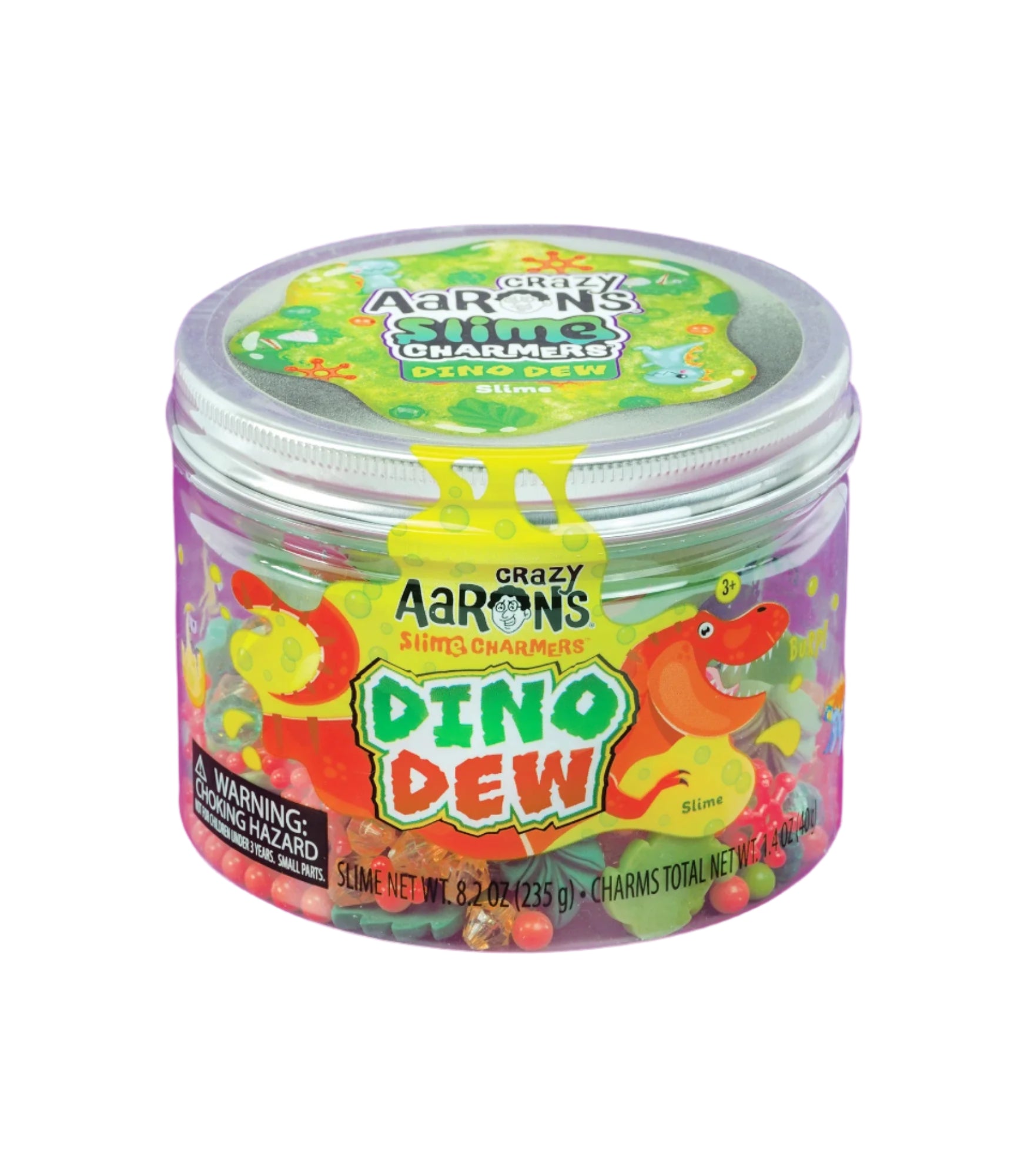 Experience Jurassic sized fun with Crazy Aaron's® Slime Charmers™ Dino Dew. This bright green slime and dinosaur themed charms and beads will have your create a world a million years in the making. Banana scented to heighten your senses. Mix, stretch and create with these dinosaur themed charms. So create your own world when dinosaurs ruled with Slime Charmers™ Dino Dew!