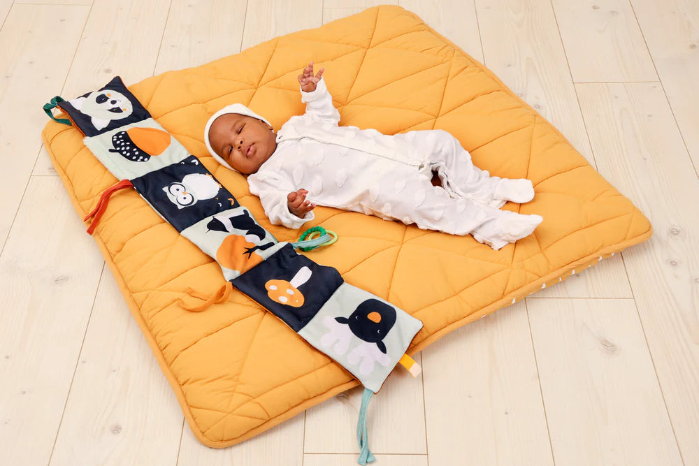 The Soft Activity Book 2 in 1 develop hand-eye coordination and support fine motor skills. This multisensory book filled with fun and engaging surprises. The contrast colours and materials help baby’s visual and sensory development in the early stages. Easily attach to crib. The teething ring help soothe baby. The mirror amuse and promote self awareness.