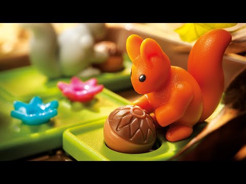 Compact game board with lid, 4 squirrels, 5 nuts, booklet with 60 challenges and solutions
