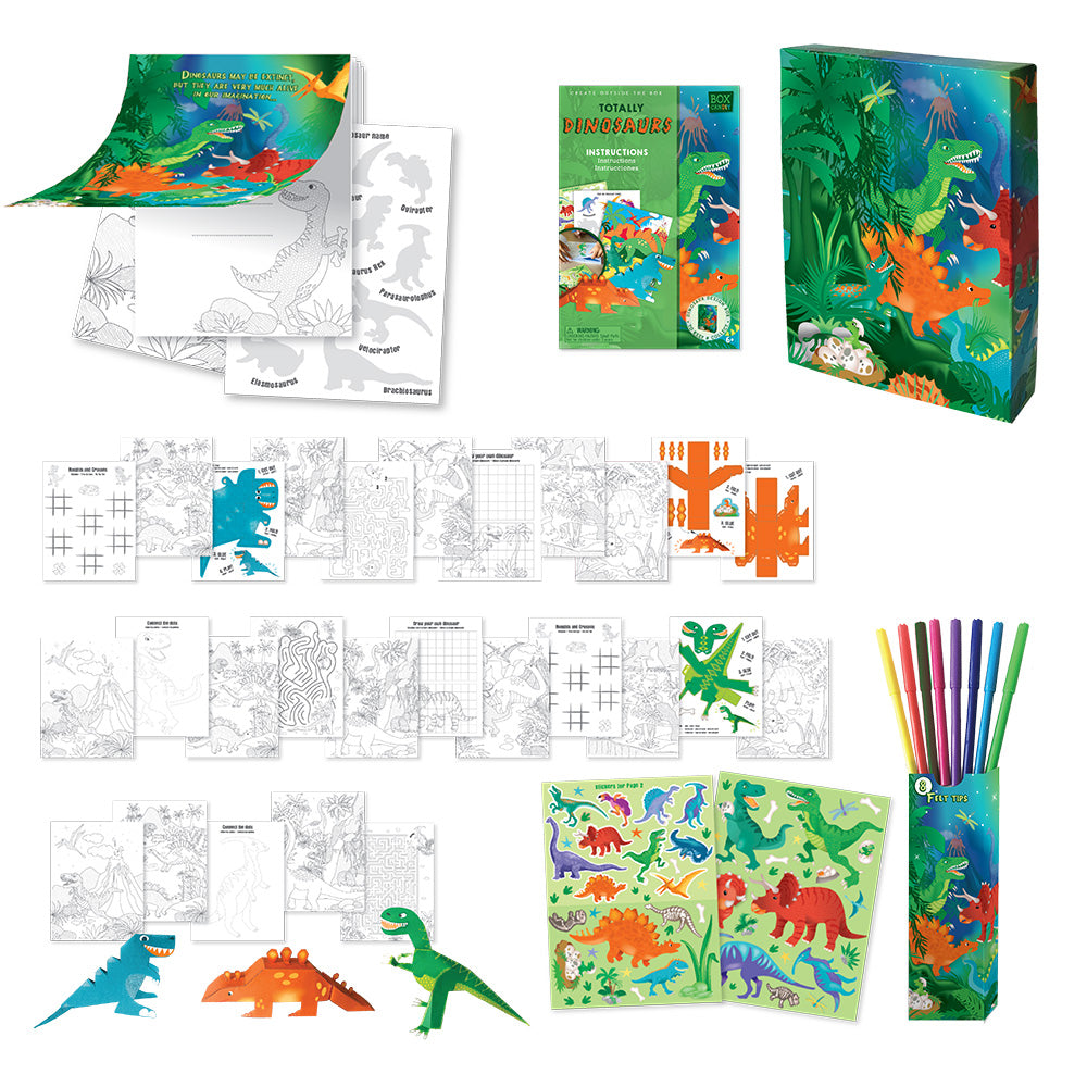 Contents: a dinosaur activity book with 30 tear-off activity pages, 2 sticker sheets, 8 color markers and instructions, all in a colorful keepsake storage box made from recycled cardboard.
