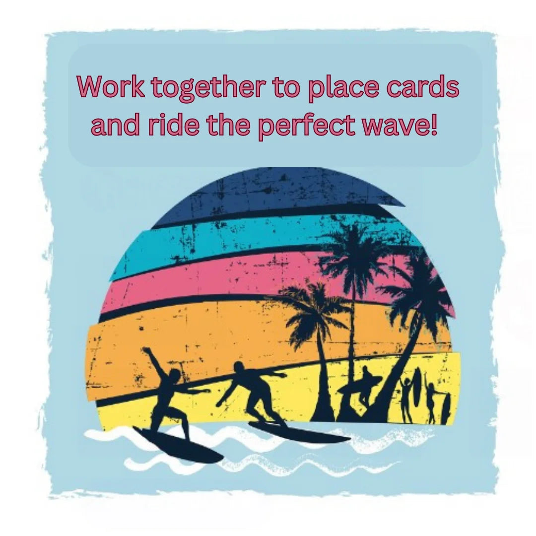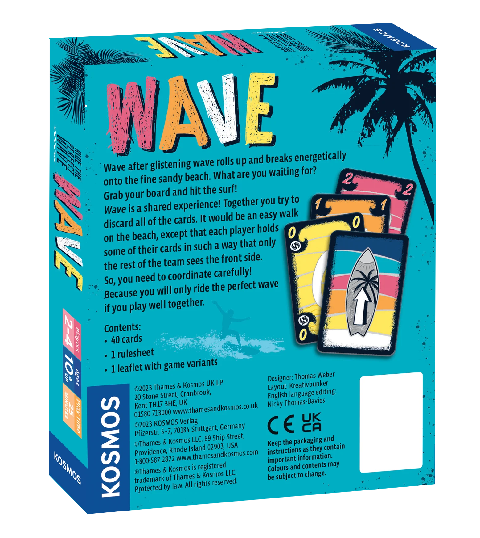 Wave is a shared experience! Together you try to discard all of the cards. It would be an easy walk on the beach, except that each player holds some of their cards in such a way that only the rest of the team sees the front side. So, you need to coordinate carefully!