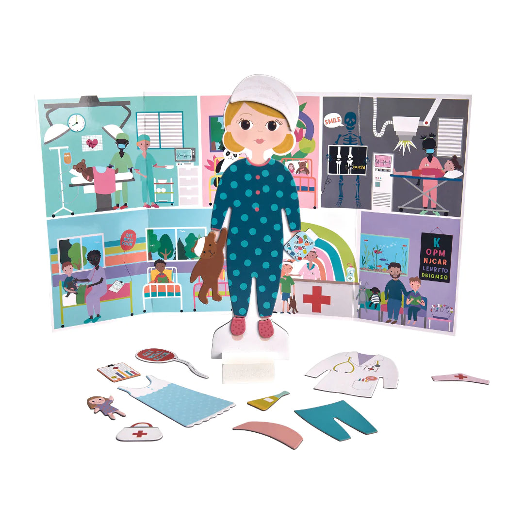 Florence loves to play hospitals! Do you? Dress her up as a doctor, nurse, patient and more. Featuring one wooden doll and a stand, a reversible backdrop scene and 40 magnetic pieces all contained in a gorgeous reusable gift box. This is the perfect gift for a budding doctor, nurse or someone who just loves to play hospitals just like Florence!